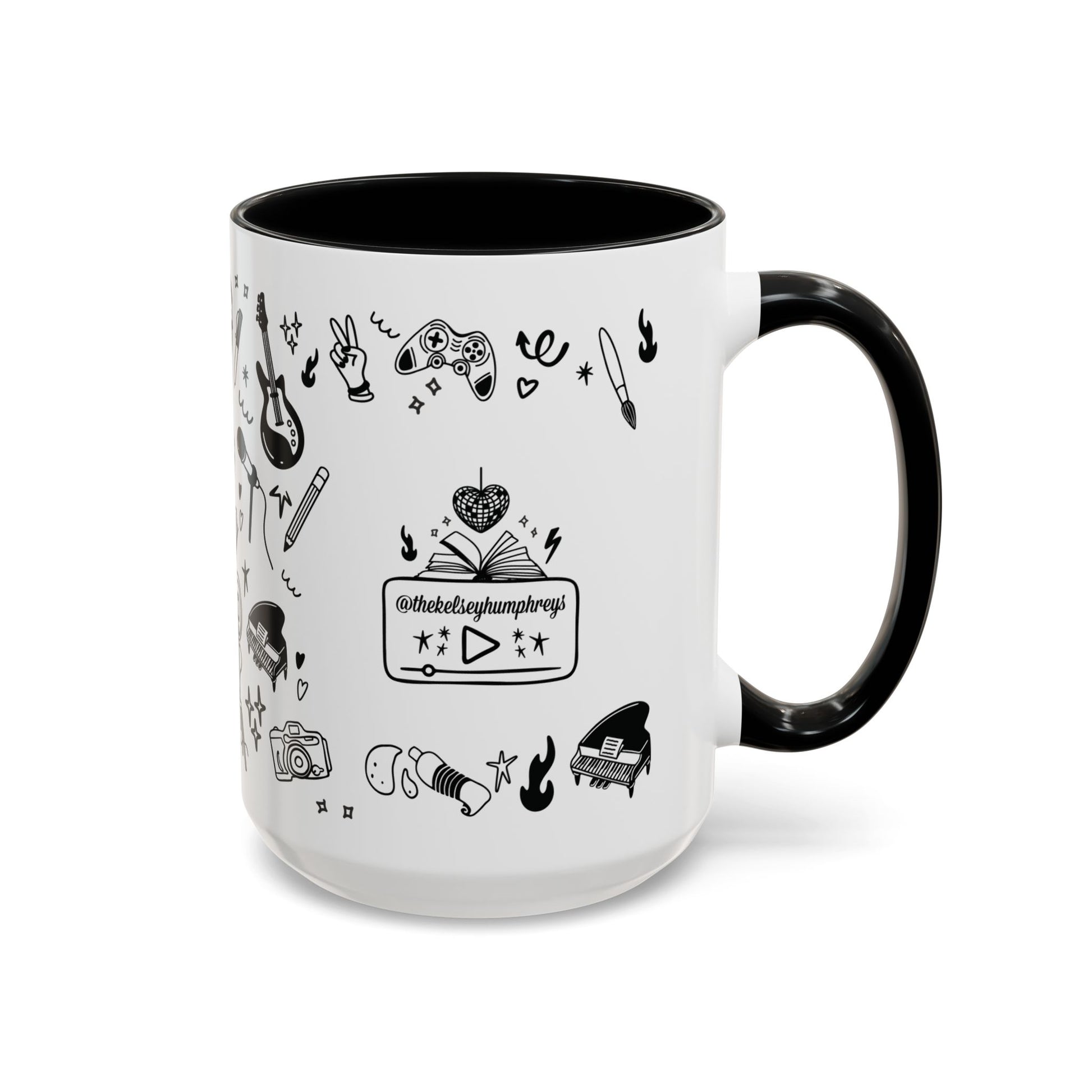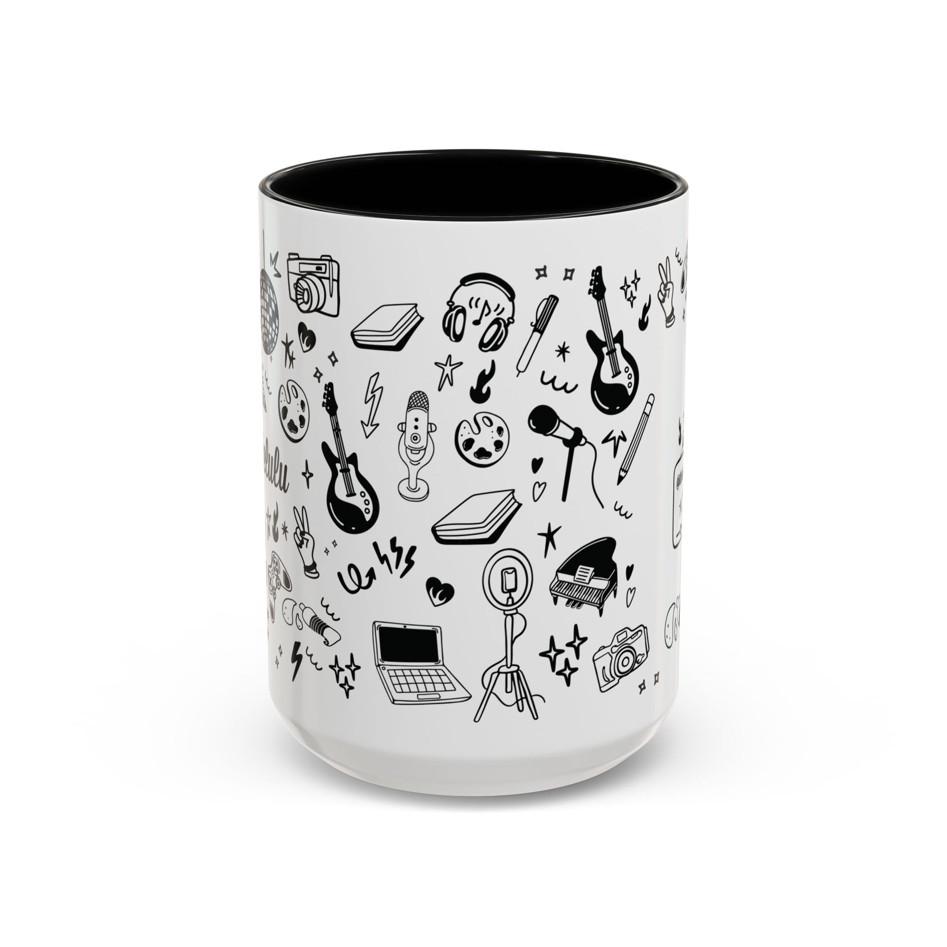 A lively ceramic mug that celebrates creative hustle — music, art, streaming, and making things that matter. Hand-drawn icons wrap the glossy white surface: guitars, microphones, cameras, paint palettes, laptops and little sparkles that nod to late-night sessions and sunrise breakthroughs. The colored interior and handle add a pop of contrast, while the sturdy C-handle and two size choices keep your workflow fueled whether you prefer a quick espresso or a long, slow pour-over. Dishwasher- and microwave-safe, lead- and BPA-free — built to stand up to everyday use in studios, home offices, and cozy corners where ideas get made.